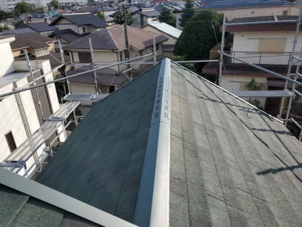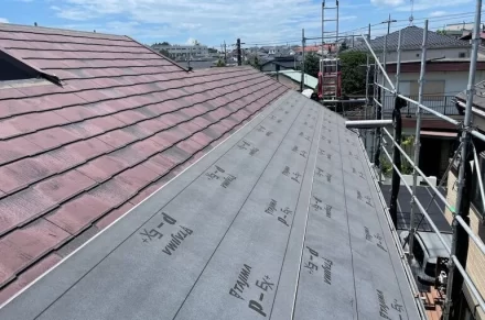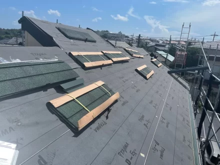 本日のお写真は、横浜市にてカバー工事を行いました。カバー工事とは、既存の屋根にルーフィング(防水シート)を敷き、その上から屋根材をカバーしていく施工です。